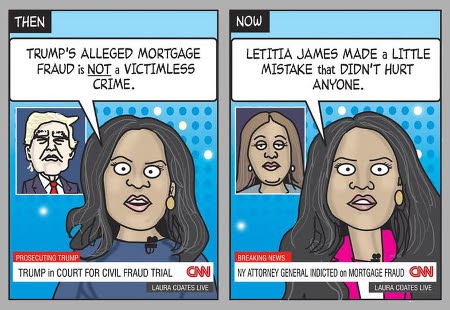 It’s also so freaking amusing to watch how CNN’s Laura Coates throw whatever legal ethics she ever had down the shitter to first attack President Trump, then defend Letitia James over the same supposed crime. But then, shitbirds of a color fly together…