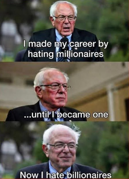Bernie Sander’s hate and the career he made out of it have significantly evolved over the years. He use to rant and rail against millionaires, until he parlayed his government position into a low multi-million dollar portfolio. So now he’s jabbering, hooting, and hollering against billionaires. 🙄
